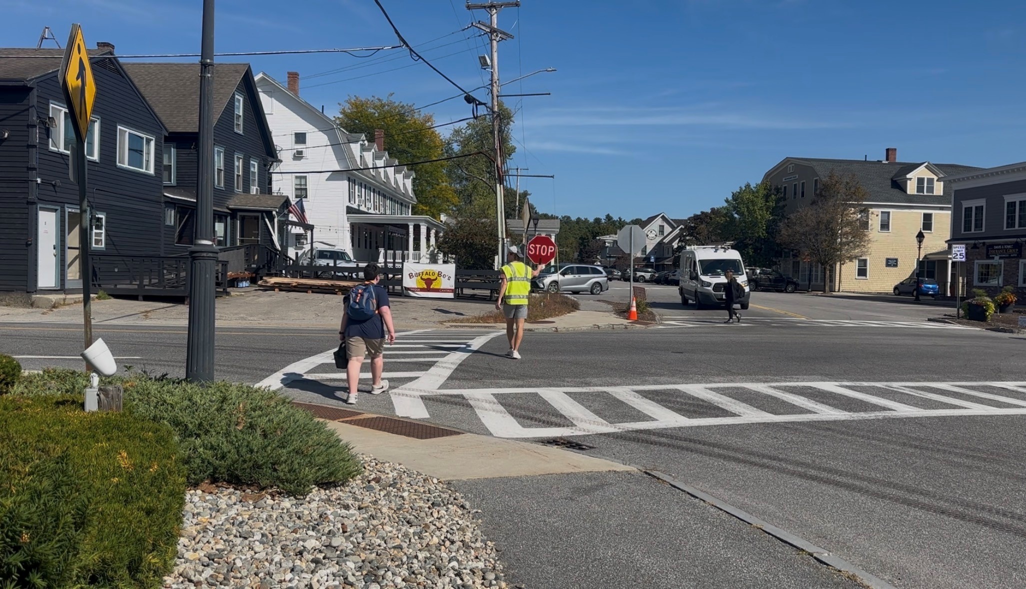 Jack Herron and Duncan Fleming, two juniors, spend their mornings and afternoons working as crossing guards for the Henniker community school, helping students arrive to and leave the school safely.